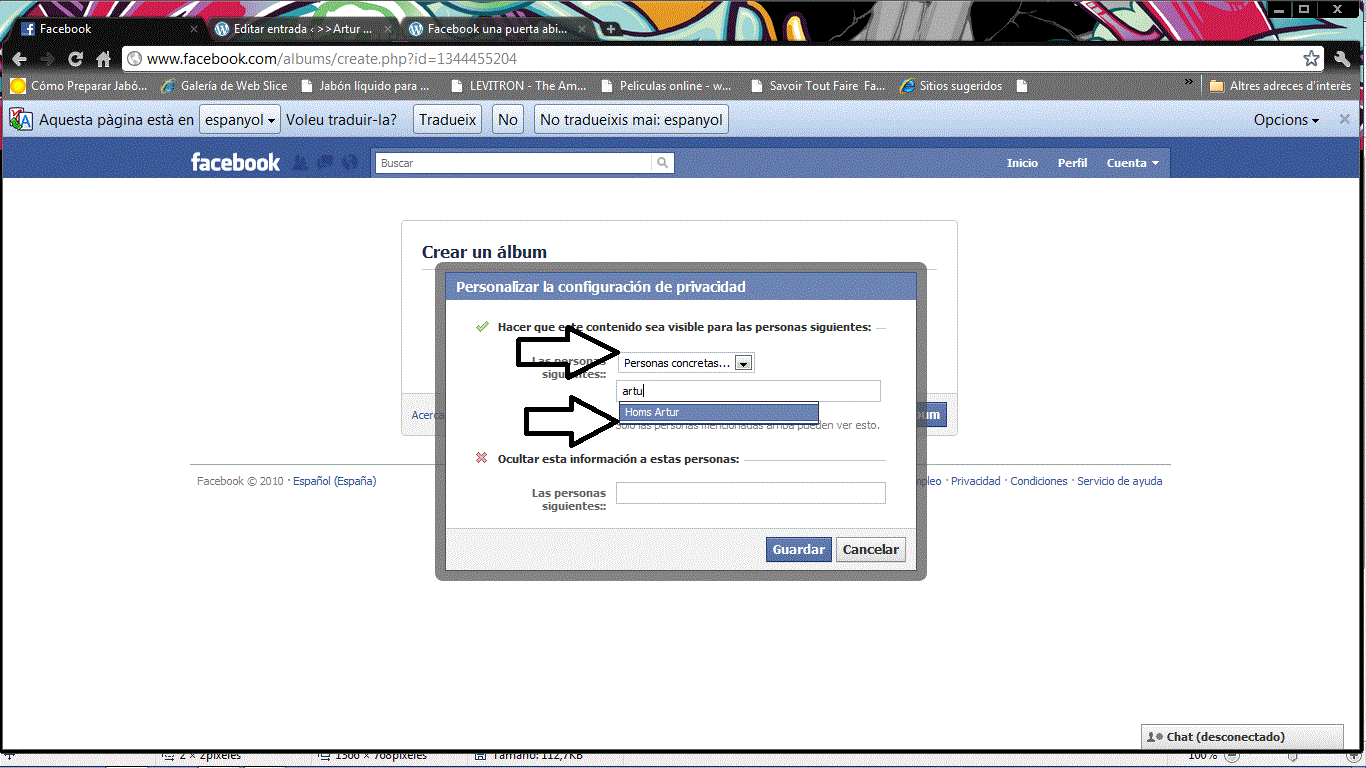En el proceso de creación, vamos a editar en ¿Quien puede ver esto? que personas van a poder ver el álbum en cuestión y agregamos solo aquellas que las puedan ver. En la siguiente imagen podemos ver que pasos debemos seguir. En el lugar indicado para que personas pueden ver el álbum, comenzaremos a escribir parte del nombre de la persona que puede ver el álbum y el ‘Facebook’ nos la va a permitir seleccionar de forma que quede como en la imagen siguiente.