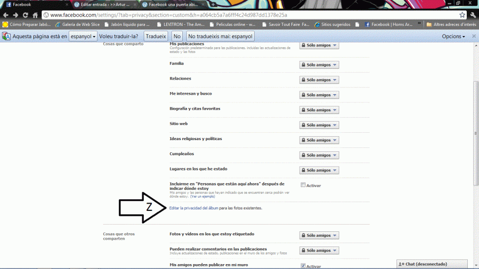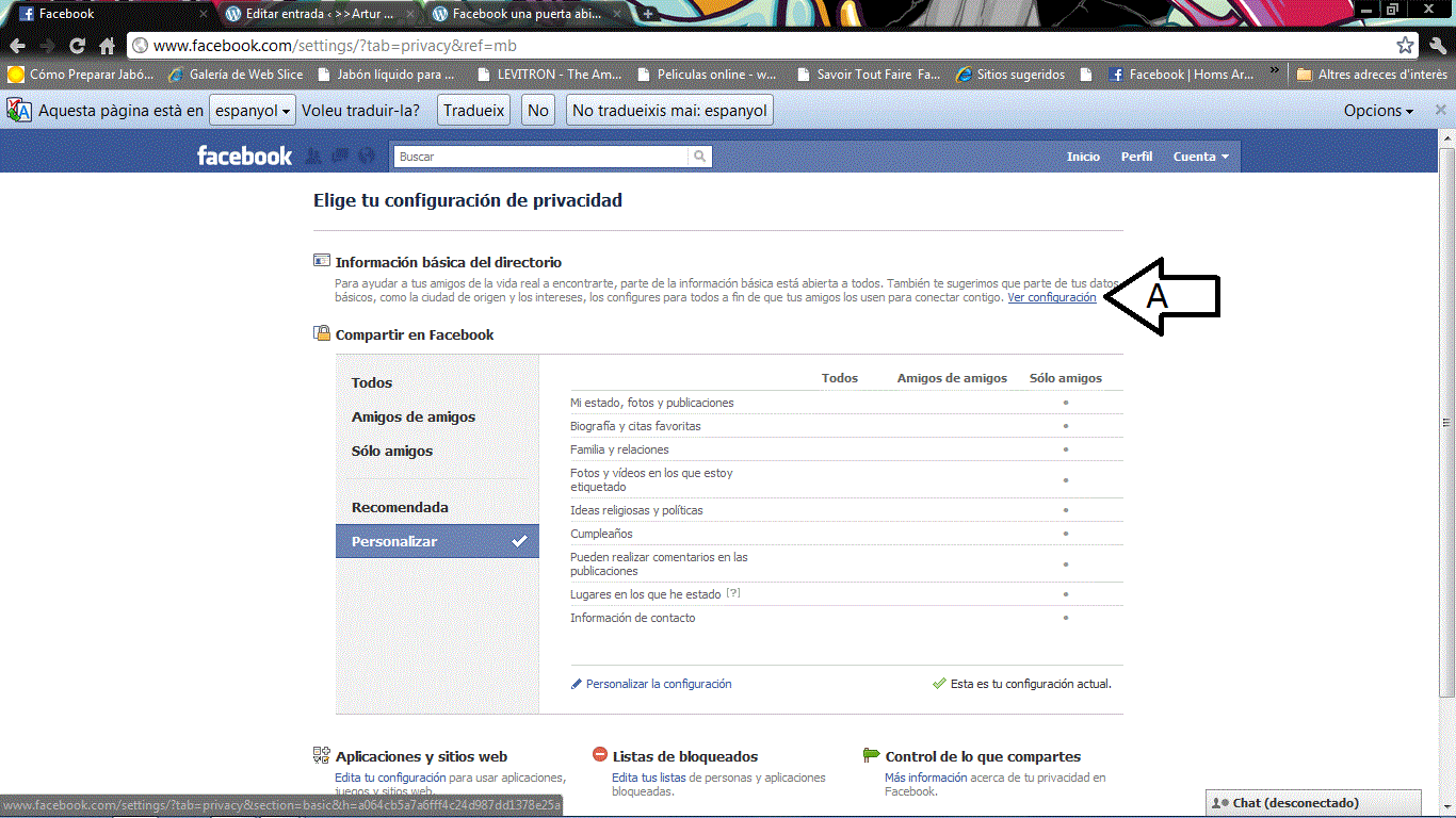 Ya casi estamos. Volvemos al menú cuenta, configuración de la privacidad. Y pulsamos sobre el texto indicado con una A en la siguiente imagen: