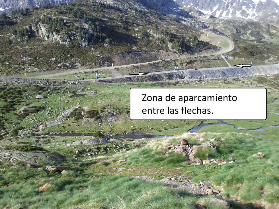 Despues de pasar el aparcamiento de las pistas continuáis subiendo, veréis que pasado un monumento de madera redondo encontrareis un buen lugar para estacionar en una recta. De hecho es el mismo camino que debéis tomar para ir hacia los lagos de Tristaina.