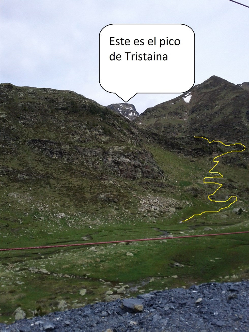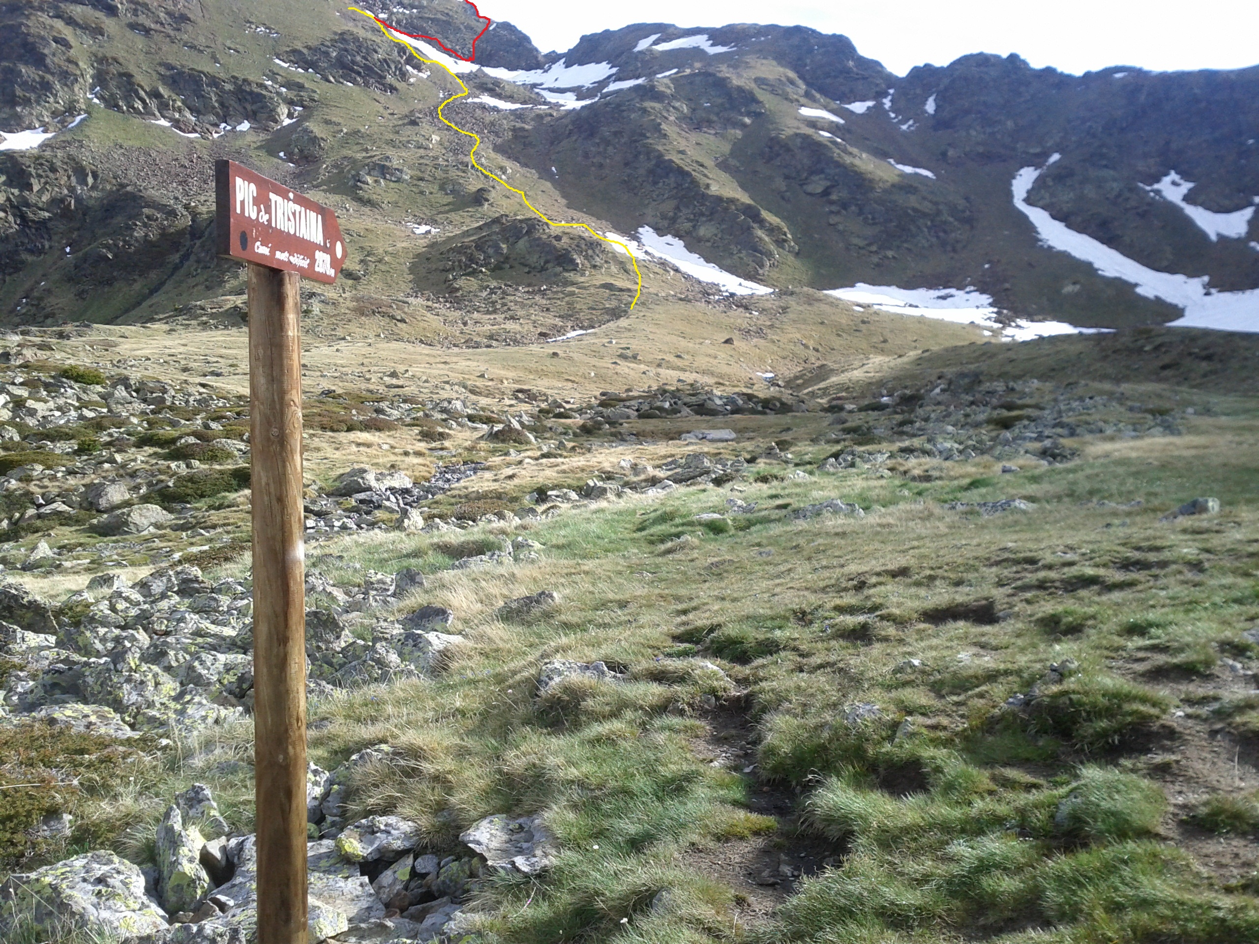 Como veis en la fotografía anterior, una vez legados al punto donde podríamos pasar por la arista, nos desviaremos hacia la izquierda de la lengua de nieve que se aprecia en la fotografía, en camino no está excelentemente marcado pero si miráis con paciencia encontrareis pequeños montículos de piedras y alguna marca redonda amarilla que significa que os dirigís hacia el pico.