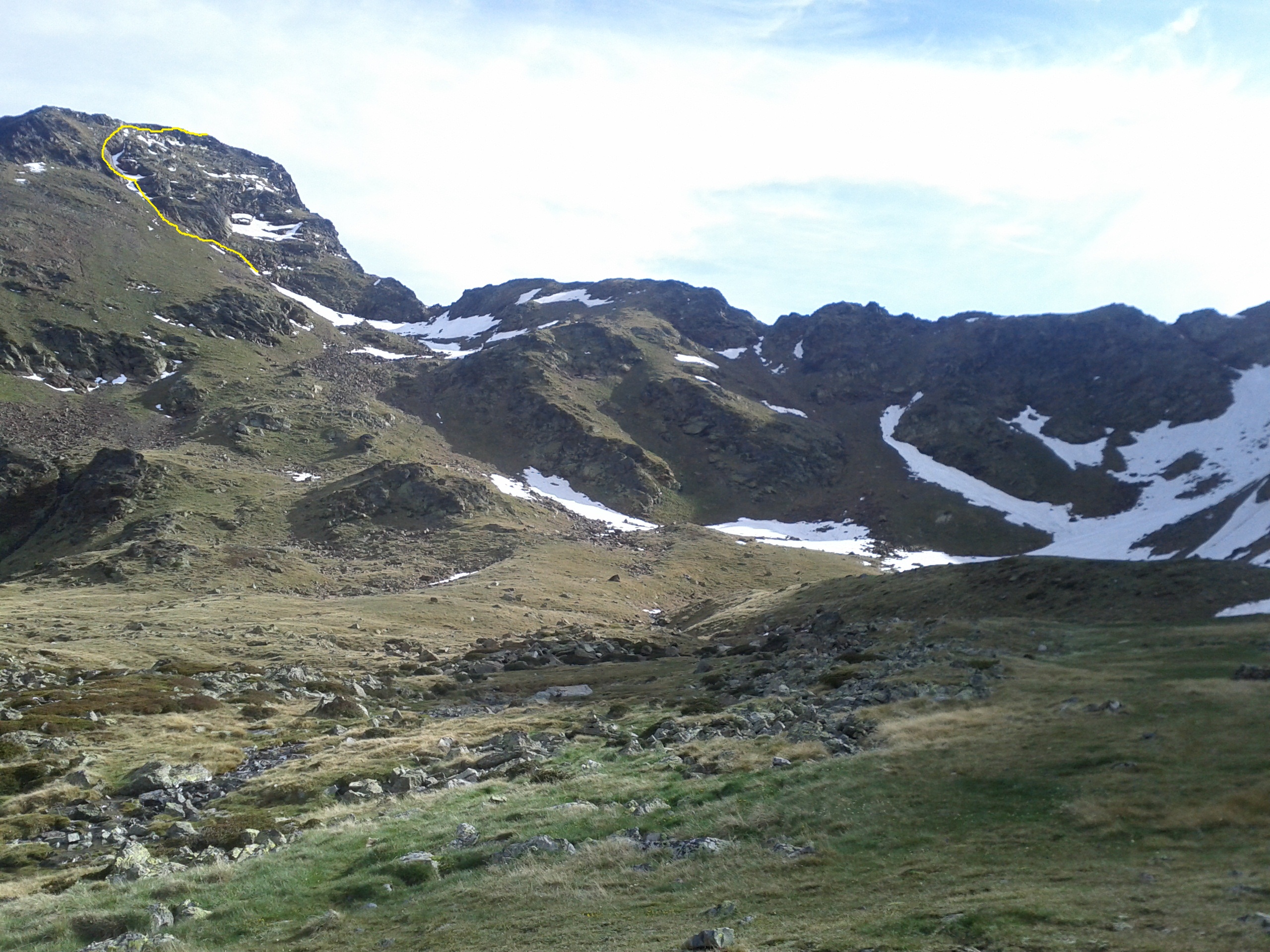 Como veréis que en la fotografía anterior tenis un camino en amarillo i en la parte superior uno marcado en rojo. El que está en rojo es para subir por la arista de la