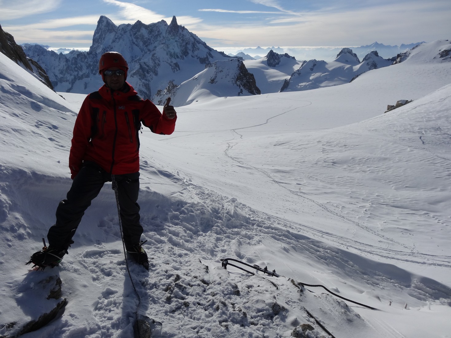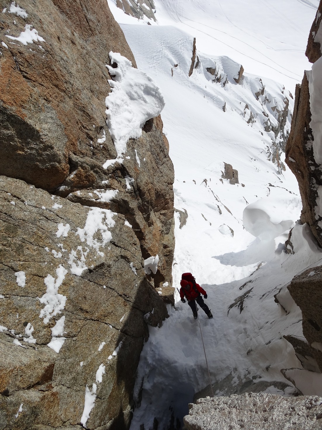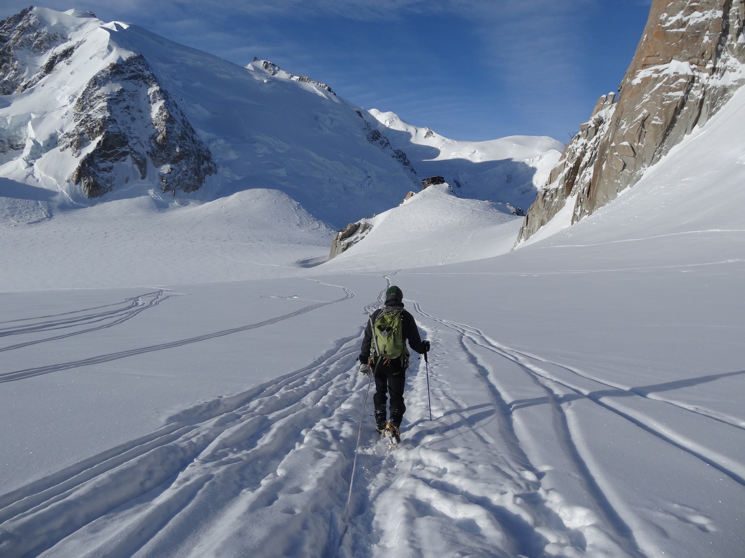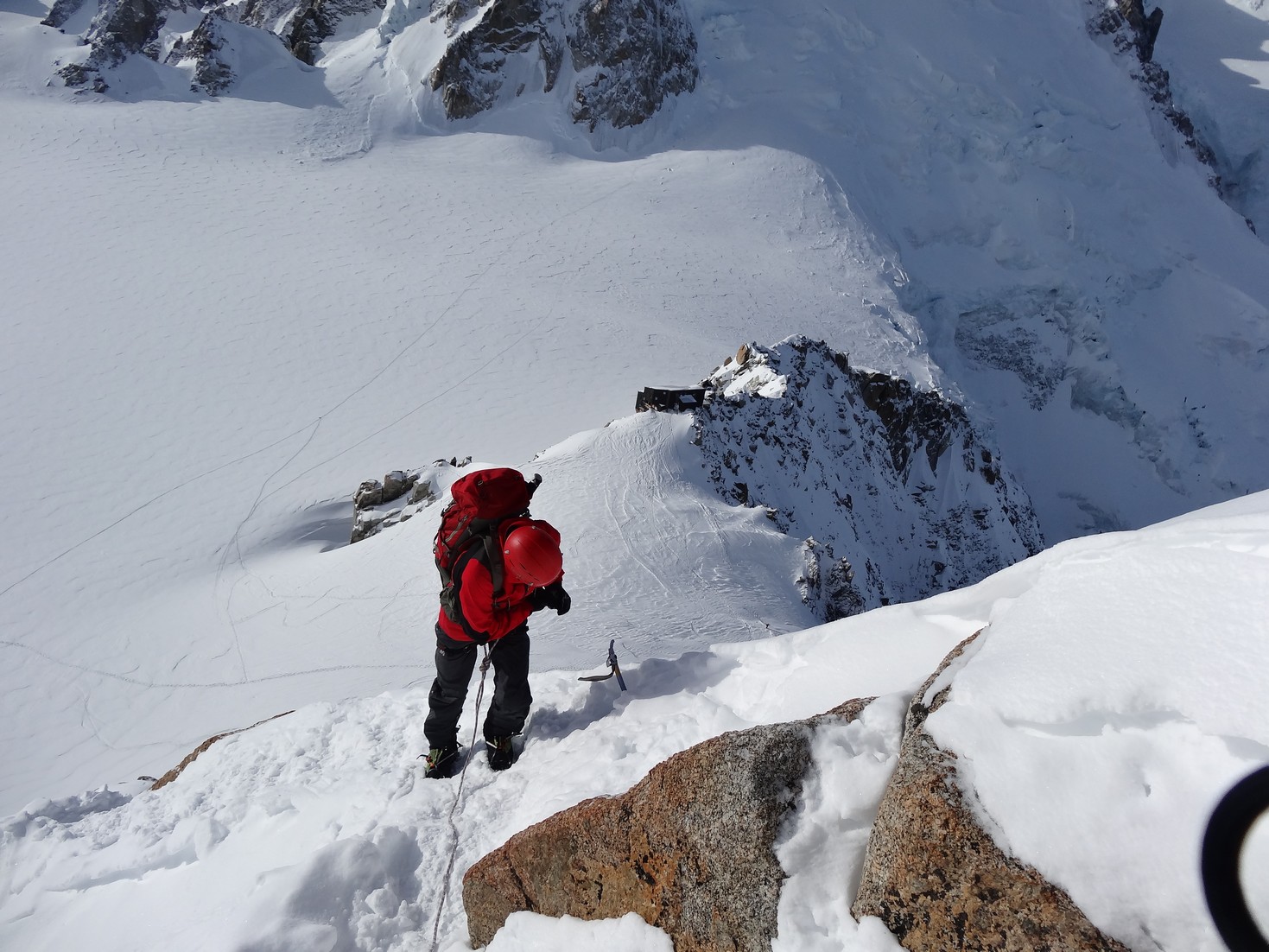 Llegaremos hasta el teleférico de l’Aiguille du Midi, y accedemos por el pasaje para alpinistas hacia la vía. El primer tramo en el que contorneamos la arista por delante bajando desde la Aiguille du Midi, pasamos por encima del glaciar, que tiene un grosor de 600 metros, es importante pasar este tramo en cordada.