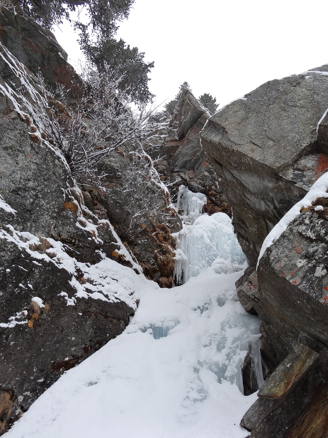 Largo 1: 30 metros, 70 °, 80 ° -85 hasta un gran bloque. Encontraremos un spit bajo el gran bloque, lo usaremos como seguro, el que asegura se queda debajo y el que sube lo hace por la izquierda como siempre en puntos opuestos para evitar la caída de hielo o piedras en la cabeza.
